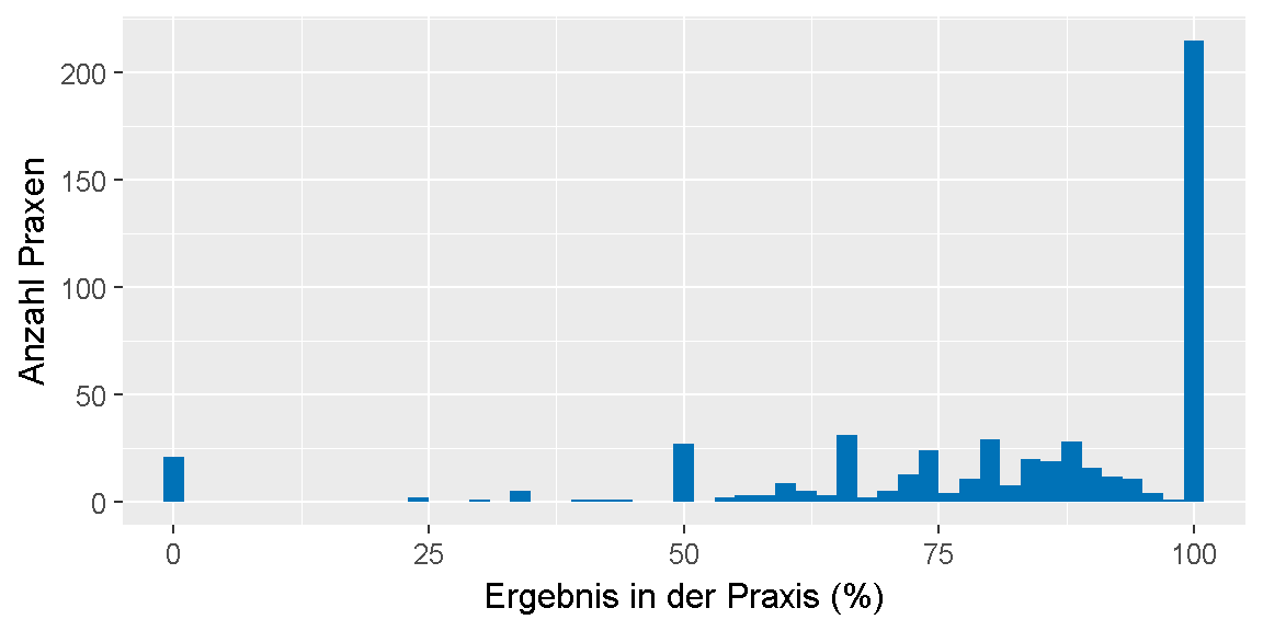 Die sprunghaften Veränderungen im Jahr 2009 sowie im zweiten Halbjahr 2013 sind die Folge von Änderungen im Berechnungsalgorithmus. Unter Berücksichtigung dieses Effekts ist im Zeitverlauf keine eindeutige Entwicklung erkennbar. Die Verteilung unter den Praxen zeigt jedoch, dass das Qualitätsziel von den allermeisten Praxen mit deutlichem Abstand erreicht wird.