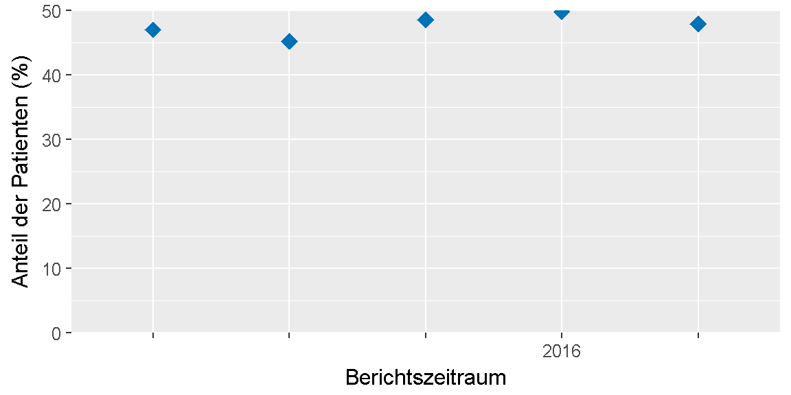 Alle teilnehmenden Praxen: 47,9 % (187 von 390 Patienten). Zu diesem Qualitätsziel ist im Vertrag kein Zielwert festgelegt.