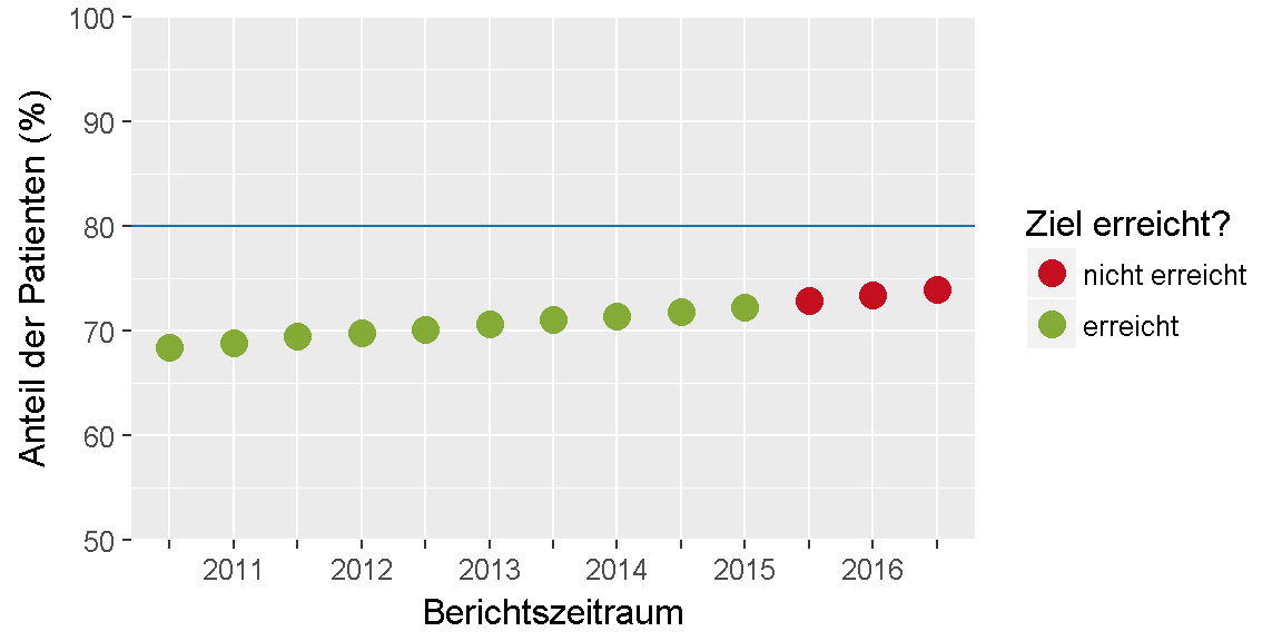 Alle teilnehmenden Praxen: 73,9 % (177.394 von 239.897 Patienten). Somit wurde das Qualitätsziel von mindestens 80 % nicht erreicht.