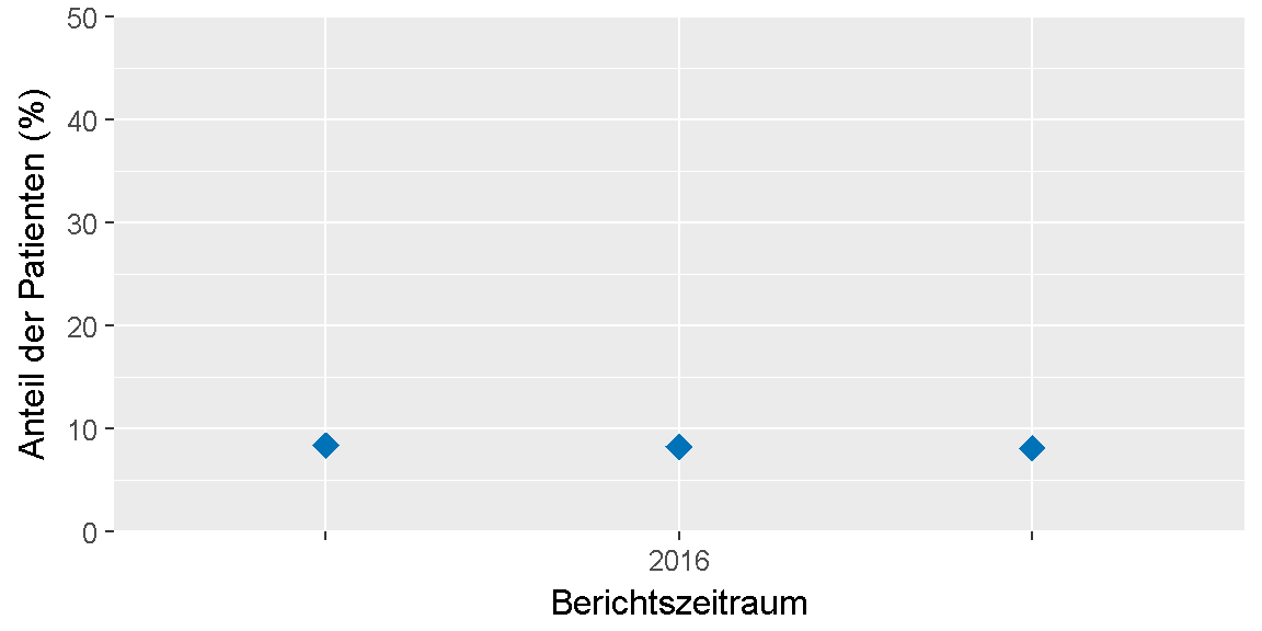Alle teilnehmenden Praxen: 8,2 % (17.838 von 218.554 Patienten). Zu diesem Qualitätsziel ist im Vertrag kein Zielwert festgelegt.